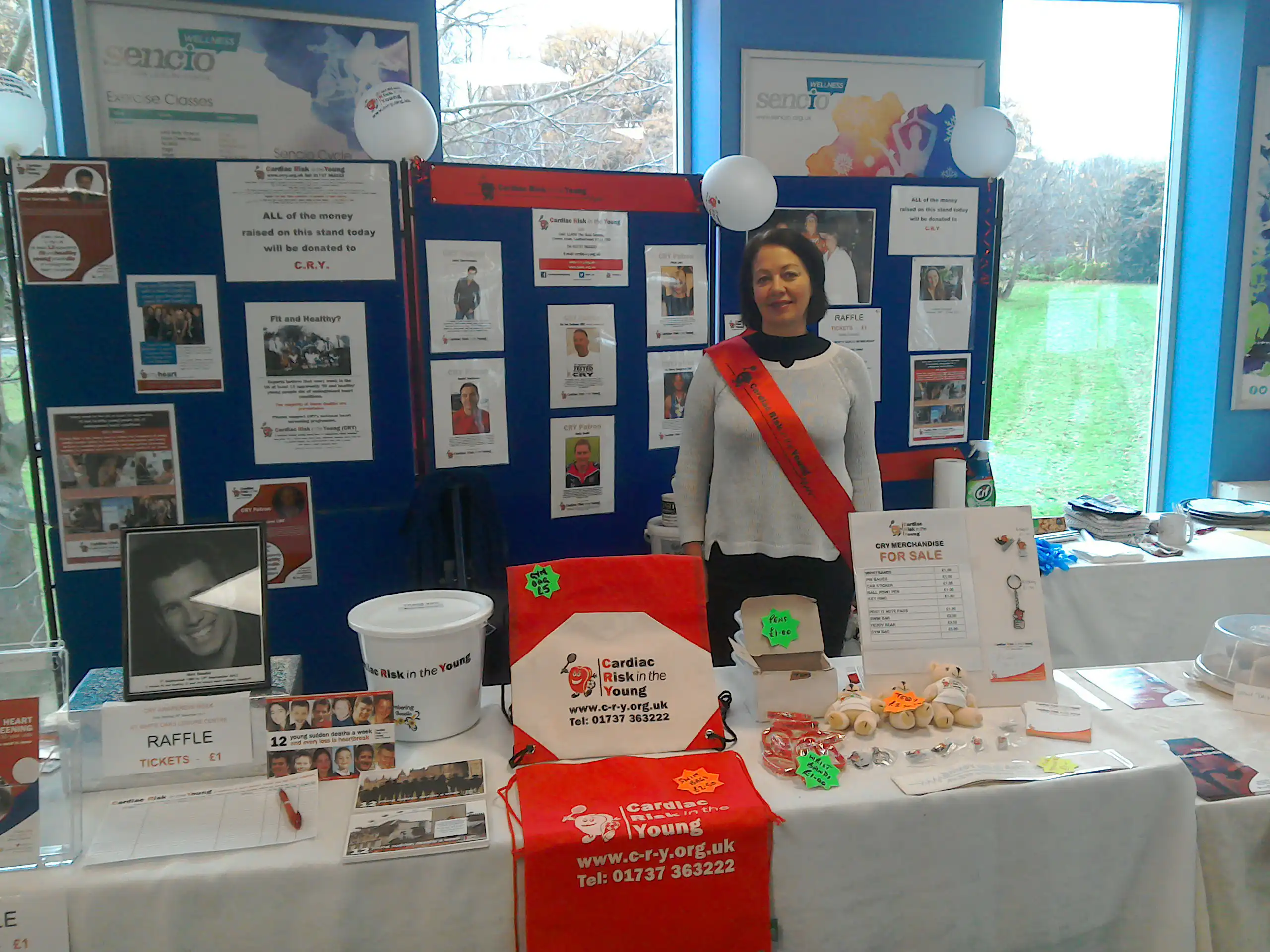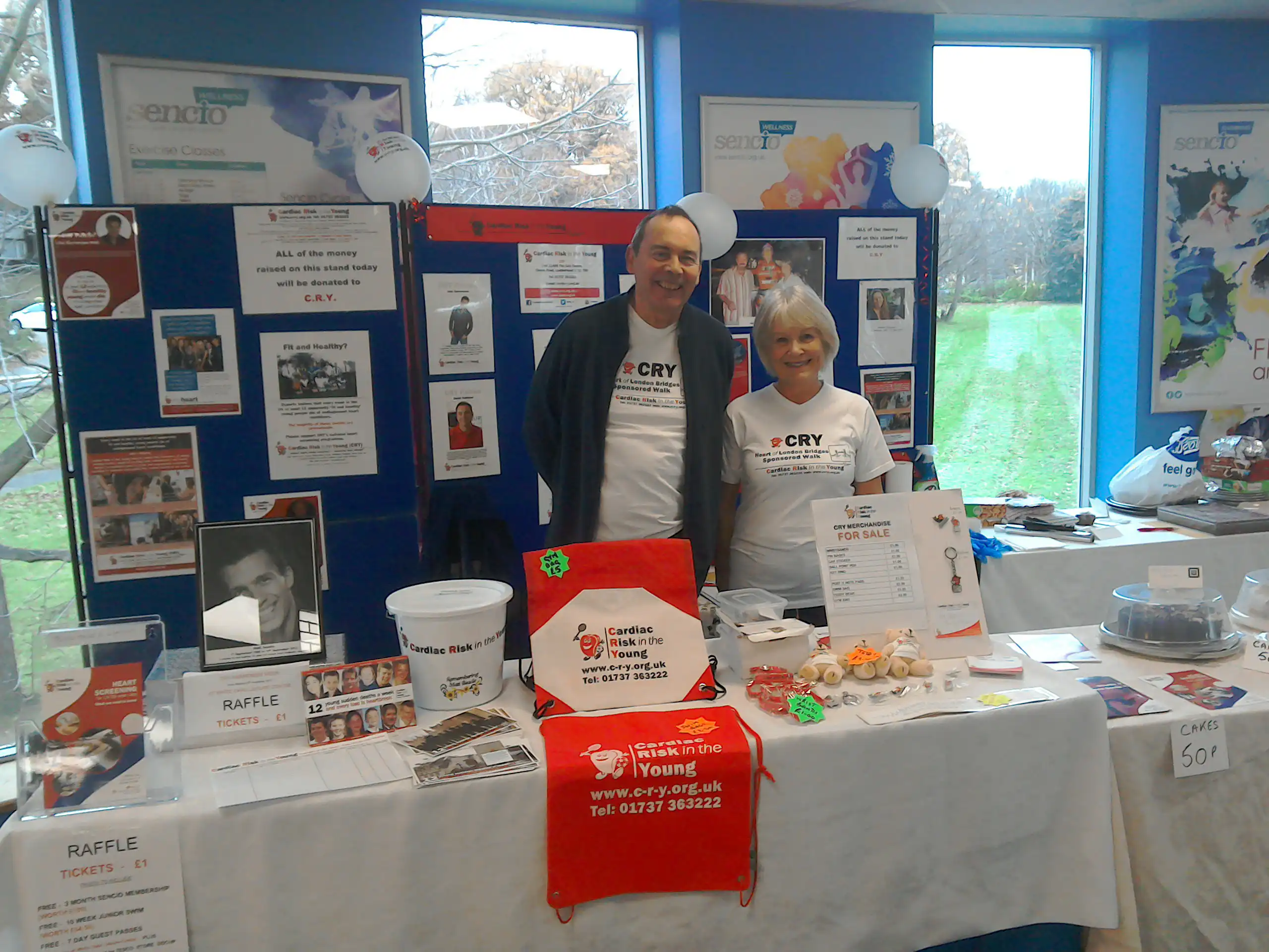We didn’t know what to expect and after a slow couple of hours people emerged from the gym, swimming pool, and different keep-fit classes passing the stand on their way out and coming over to take a look. Before we knew it cakes and raffle tickets were selling like hot cakes! It slowed down during lunch but the afternoon and evening was busy again with swimming, karate, badminton and squash clubs etc. Nearly all the cakes went, but more importantly we handed out leaflets to everyone who passed us and spoke with so many people. We were amazed at how many people knew of someone who had suffered a sudden death but had no idea of how many it happened to each week or about CRY and the help they could offer. By the end of the day we were shattered but elated by how many people had taken on board the information we had given.