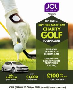 Golf for the men, relax and have a Spa Day with the ladies, all at the magnificent Carden Park in Cheshire. JCL Insurance are again holding a Golf Day in memory of Matthew and to help us raise funds for supporting CRY. Teams of 4 or come along and get randomly allocated a team, just remember,
