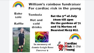 William would like to raise money for CRY Cardiac Risk in the Young. William had lots of ideas so we thought we would do a fundraiser in memory of Jamie-Leigh. We will have cakes of many varieties individually package so very COVID safe, hot and cold drinks along with a raffle with a top prize of